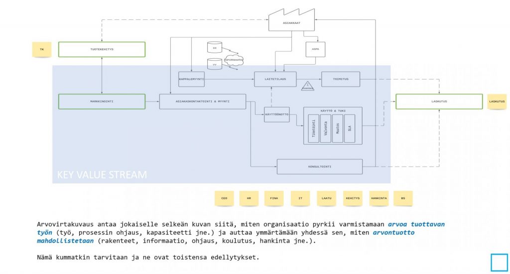 Ja kun oleelliset arvot, prosessit, vastuut, rakenteet ja mittarit on määritelty arvovirran pohjalta (=miten tuotetaan arvo asiakkaalle ja miten luodaan ja lunastetaan lupaukset), niin mahdollistamalla nämä ja ohjaamalla näitä, luot kykyä tuottaa arvoa asiakkaalle ja siten kykyä lunastaa asiakaslupaukset. Jatkuvasti.
