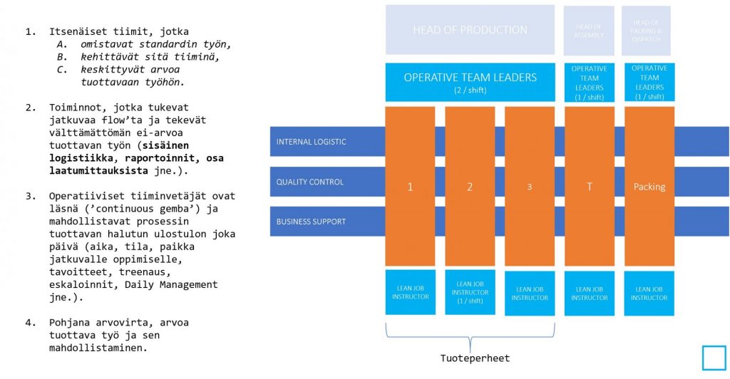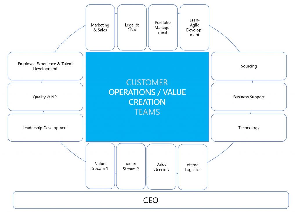 1. Laita keskiöön ‘Key Value Stream’ ja viimeistele mahdollistavat organisaatiot ja/tai tiimit – ja anna asioiden tapahtua (esimerkkikuva).